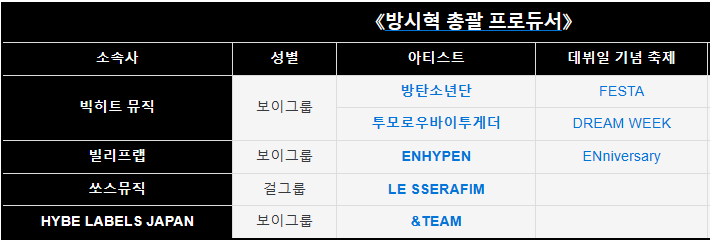 방시혁이 프로듀서로서 참여하고 있는 아티스트에는 방탄소년단뿐만 아니라, 투모로우바이투게더와 더불어, 작년에 데뷔하여 걸그룹 세계를 바꿔놓은 르세라핌을 보유하고 있으며, 특히 방탄소년단은 전 세계에서 가장 유명한 가수 중 한 팀으로 성장시킨 장본인이 바로 방시혁 프로듀서입니다.