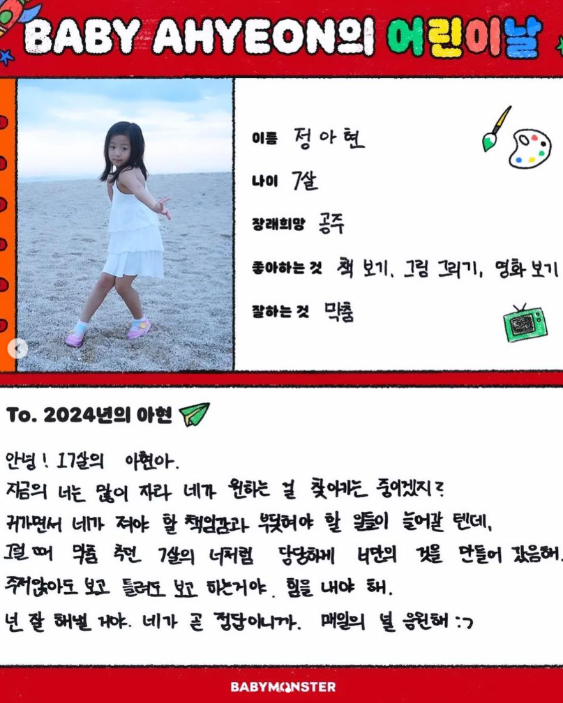 7살의 아현은 장래희망에 '공주'라고 적었으며, 여타의 많은 어린아이처럼 공주님을 꿈꾸는 소녀였습니다.^^ 그리고, 2024년의 아현에서 쓴 편지에도 7살의 글씨체라고는 믿기지 않을 정도로 또박또박한 글씨체를 뽑냈고요, 정말 귀여운 편지를 공개했습니다. 베이비몬스터의 센터이자 리드보컬인 아현은 베이비몬스터에서 빠질 수 없는 핵심 멤버고요, 진짜로 보컬실력은 탈아이돌급이라고 생각합니다.