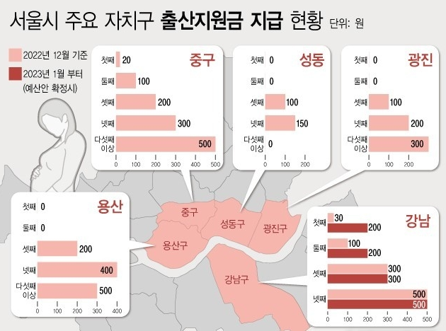 서울 강남의 경우 출산지원금이 첫째 200만원, 둘째도 200만원을 주며, 셋째 300만원, 넷째 500만원을 지급하고 있으며, 서울에서 가장 큰 금액의 출산지원금을 제공하고 있습니다.