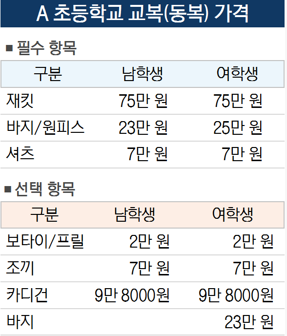 겨울철 동복 교복을 구입하게 되면, 남학생 교복값은 123만 8천 원이며, 여학생의 교복은 148만 8천 원에 이르게 됩니다. 통상 사립초등학교의 겨울 교복비용은 22만 원에서 28만 원 정도이며, 이렇게 이슈가 되었던 부산 남성 초등학교의 직전 교복비용은 28만 원이었습니다.