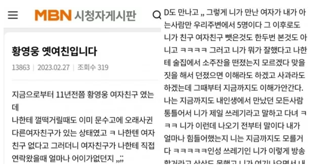 2월 27일 또 다른 황영웅의 옛 여친이 등장했습니다. 지금으로부터 11년 전 고등학교 때 사귄 전 여자 친구이라고 밝힌 그녀는 황영웅이 친구 여자친구 뺏은 것을 한두 번 본 것도 아니고, 황영웅이 술집에서 소주잔을 던졌는데 아무런 이유 없이 던진 이유를 지금도 이해가 되지 않는다라며, 지금까지 내 인생에서 만났던 모든 사람 통틀어서 황영웅이 제일 쓰레기라며, MBN시청자 게시판에 올렸습니다.