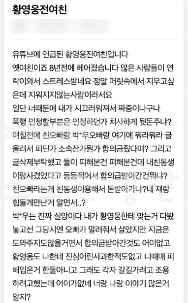 그리고, 8년전 황영웅의 전여자 친구이라고 주장하는 사람이 나타나서, 최근에 황영웅 때문에, 생각도 하지 싫은 과거 기억이 떠올라 끔찍하다며 정말 짜증 난다고 폭행을 한 것에 대해 진심으로 사과를 하던가, 치사하게 PD한테 뒷돈을 제공하면서면서까지, 글을 삭제하냐고 아직까지 8년 전에 황영웅에게 폭행당했던 일이 기억나 정말 짜증 난다고 sns를 통해 공개하였습니다.