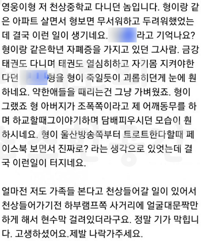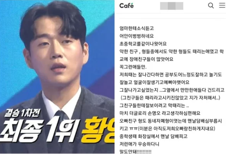또 다른 황영웅에 대한 폭로가 나왔습니다. 황영웅은 친구와 형들까지 폭행을 하는 친구였으며, 장애인들까지 꼭 약한 애들만 폭행하는 더 글로리의 손명오라고 생각하면 된다고 밝혔습니다. 중학교 때 맨날 담배 피우던 아이가 결승 1차전 생방송에서 1위를 하다니 많이 놀랐다고 합니다. 만약 다음 주 방송되는 결승 2차전에서도 1위를 차지한다면 우승상금 6억 원을 받게 되는데, 불타는 트롯맨 측에서는 어떤 결과가 나올지 지켜볼 필요가 있을 듯합니다.