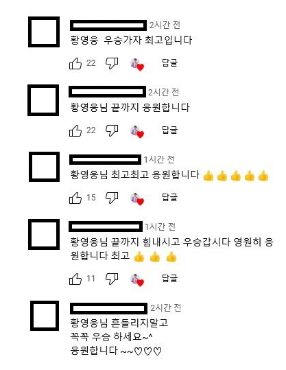 하지만, 황영웅을 응원하는 팬들은 아주 소수이며, 대부분은 황영웅의 하차를 지지하고 있으나, 불타는 트롯맨 제작진은 황영웅의 좋지 않은 소식이 이어짐에도 불구하고 아직도 울산에서 황영웅 촬영을 지속하고 있으며, 제작진은 황영웅의 하차는 전혀 고려하고 있지 않는 것 같다며 황영웅이 상해 전과로 300만 원의 벌금을 냈으며, 모든 전과 절차에서도 한 번도 피해자에게 사과를 하지 않았다며, 2016년 울산 지방검찰청에서 내려진 황영웅의 처벌 기록을 공개하기도 했습니다. 또한, 황영웅에게 당한 피해자는 황영웅이 어떻게 보복할지 모르니 너무나 두렵다며 피해자의 트라우마는 여전히 매우 높았습니다.