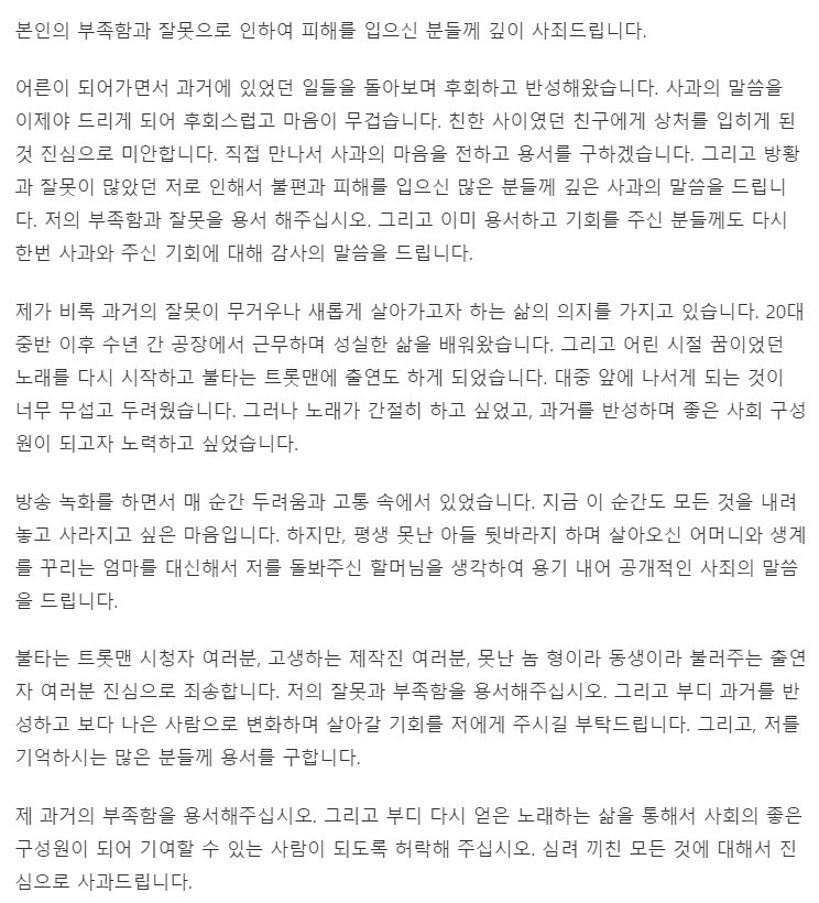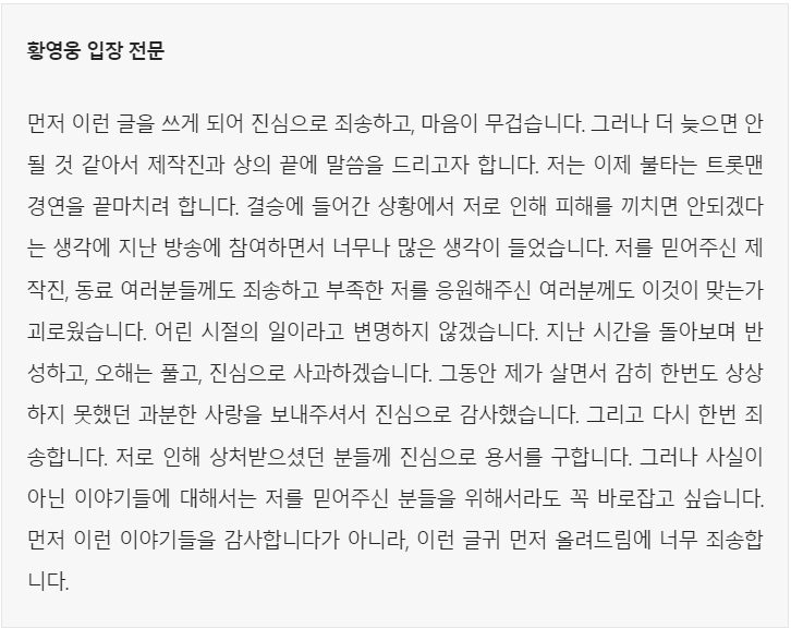 불타는 트롯맨 황영웅이 '제 부족함과 잘못으로 인해 피해를 보신 분들께 깊이 사죄드린다'면서 자신을 둘러싼 폭행 논란에 대해 사과하는 입장문을 내며, '사과의 말씀을 이제야 드리게 되어 후회스럽고 마음이 무겁다'며, 친한 사이였던 친구에게 상처를 입히게 된 것에 진심으로 미안하다며 직접 만나서 사과의 마음을 전하고 용서를 구하겠다'라고 전했습니다.