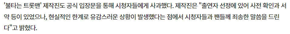2월 25일 불타는 트롯맨 측은 출연자 선정에 있어서 사전 확인과 서약 등을 맺었으나, 현실적인 한계로 유감스러운 상황이 발생했다는 점과 시청자 분들과 팬 분들께 죄송한 말씀을 드린다며, 결국 황영웅의 과거 논란에 대한 입장을 밝혔습니다. 명확한 사실 관계 확인을 위해, 입장 정리가 늦어진 점에 대해 사과드린다고 덧붙였습니다.