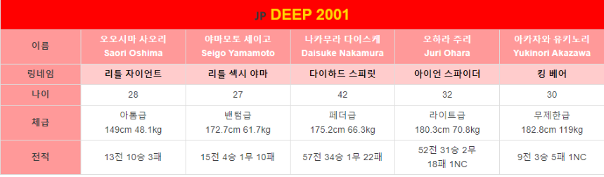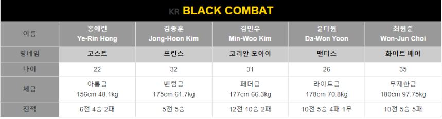 국내 격투단체 1위로 불리는 블랙컴뱃이 일본의 오랜 전통을 자랑하는 딥(Deep)과 한일전을 갖게 됩니다. 한국대표로는 아톰급 홍예린, 밴텀급 김종훈, 페더급 김민우, 라이트급 윤다원, 무제한급 최원준이 출격을 하게 되며, 2월 5일 수원컨벤션센터에서 경기를 갖게 됩니다.