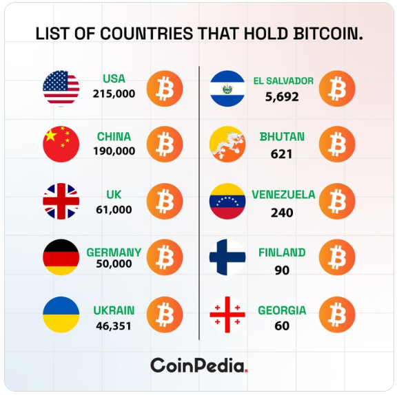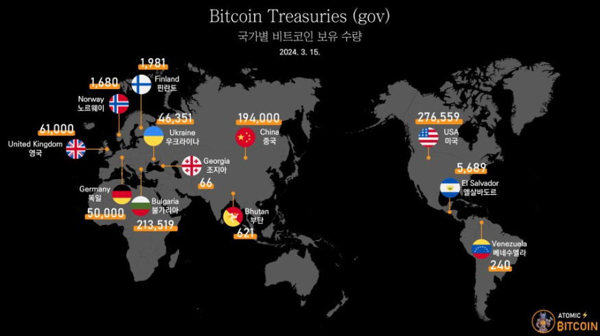 2024년 현재 국가별로 비트코인을 보유한 현황을 정리해 드리겠습니다. 이 비트코인 숫자는 국가별 투자자들이 보유한 수량이 아닌, 국가 예산을 사용하여 국가에서 보유한 수량임을 말씀드립니다.
