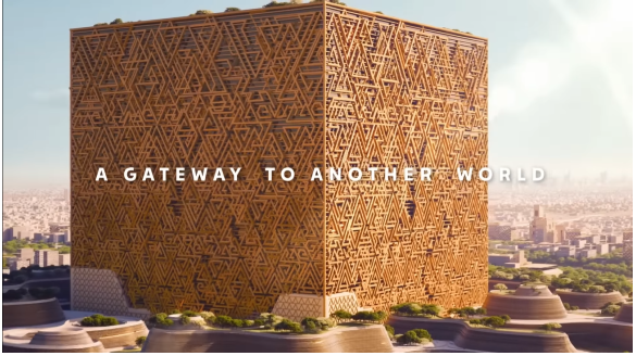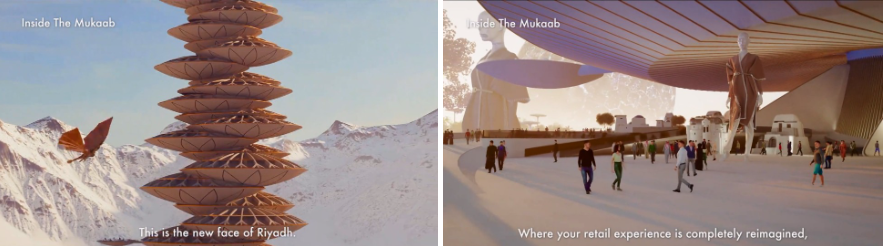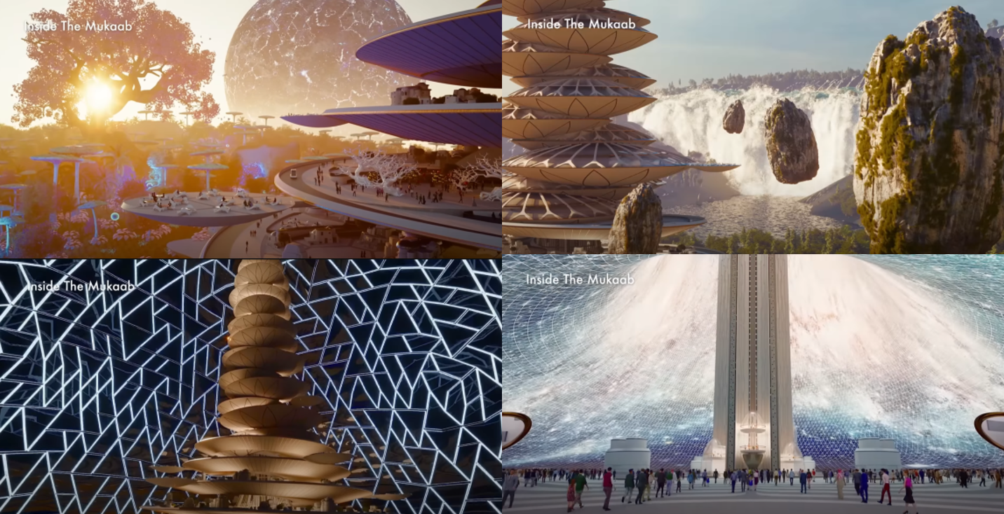 사우디 국부펀드인 PIF가 공개한 '뉴 무라바' 프로젝트에는 홀로그램 기술이 활용되어, 육각형 모양의 무카브 내부의 풍경이 시시각각 바뀌고 우주선 모양의 로봇이 날아다니며, 공중에 거대한 바위가 떠다니는 등 SF 영화에서나 볼 만한 장면들이 나오고 있습니다.