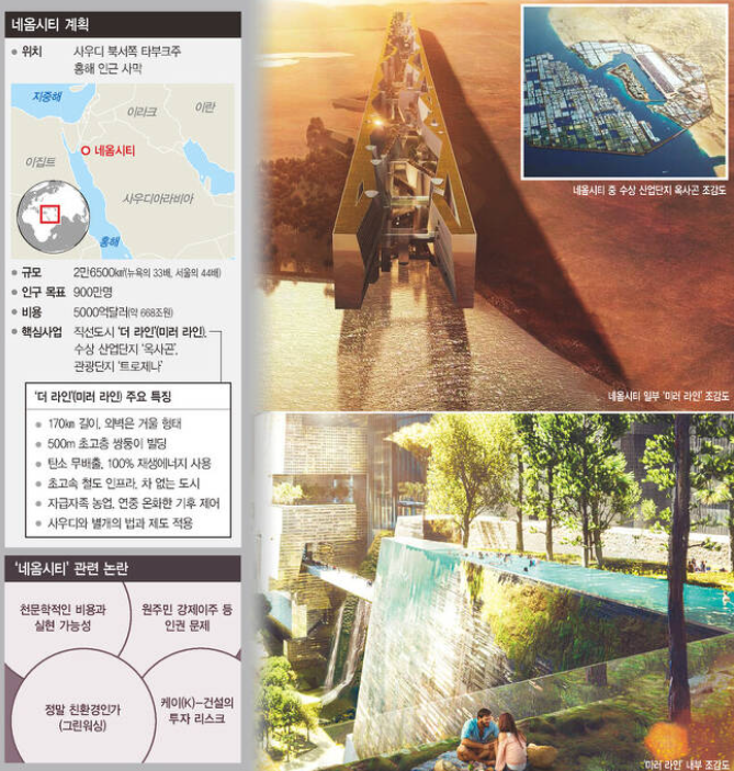 사우디의 무함마드 빈살만은 이미 2030년에 미래형 도시인 네옴시티를 건설할 예정이며, '더 라인'이라고 하는 170km 길이로 마천루는 500m 규모의 신도시를 이미 공개한 바 있습니다.