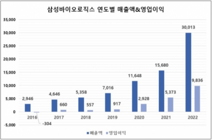 삼성바이오로직스의 연도별 매출 및 영업이익을 보시기 바랍니다. 2017년도에 흑자로 돌아섰으며, 2020년도에 매출 1조와 영업이익이 1천억 원을 처음으로 넘어서며, 2,928억 원을 기록하며 2020년 이후, 고실적을 기록하기 시작했으며, 2021년도에 고성장에 이어, 2022년도에는 거의 2배 가까운 성장을 기록했습니다.