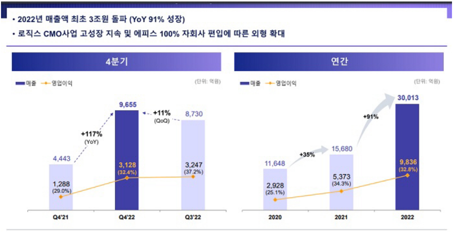 삼성바이오로직스의 2022년도 4분기 실적이 발표되었으며, 분기 매출액이 9,655억 원을 기록하며, 역사적인 신고가를 세웠으며, 2022년도에는 무려 3조 원을 돌파하면서 제약업계 최초로 매출 3조 원을 넘어서는 기록을 세웠습니다.