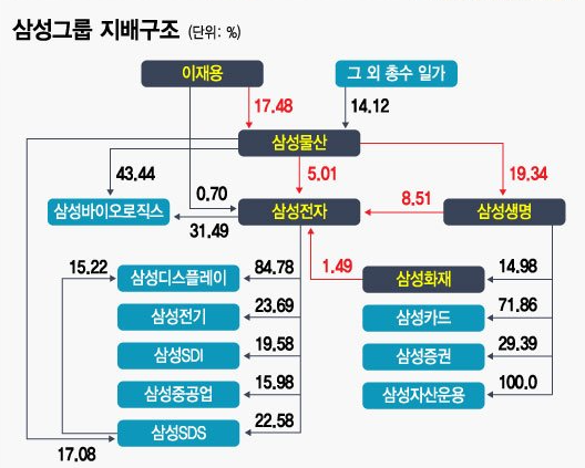 이재용 삼성전자 회장은 삼성물산(17.48%)을 지배하고 있으며, 삼성물산은 삼성생명(19.34%)을 지배하고 있고, 삼성생명은 삼성전자(8.51%)를 지배하고 있습니다. 즉, 이재용 회장은 삼성전자의 주식 비중이 1.63%에 불과한데, 삼성전자를 간접적으로 지배하는 구조이기 때문에 이 부분이 문제가 될 수 있습니다. 따라서, 삼성생명법이 시행되고 삼성생명이 삼성전자 지분을 매각하게 될 경우, 삼성물산이 매각대금을 마련할 수 있습니다. 이것이 가능한 이유는 삼성물산이 삼성바이오로직스의 지분을 43.44%나 보유하고 있기 때문에 가능한 일입니다. 따라서, 이 시나리오대로 진행이 된다며, 이재용 회장 - 삼성물산 - 삼성전자로 지배구조가 단순화될 수 있습니다.