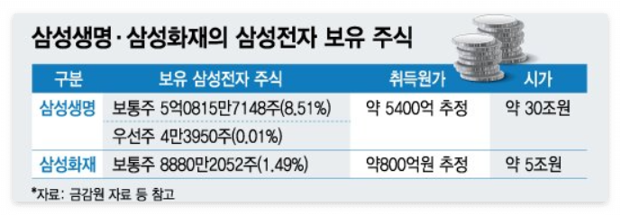 - 삼성생명이 취득한 삼성전자 주식을 현재 시가인 6만 원으로 책정한다면 약 30조 원이 됩니다.