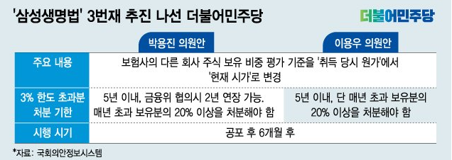 더불어민주당 박용진 의원이 2020년에 발의한 이 법안에 대해 소관 위 심사 상정은 되었지만, 2년 내내 처리는 되지 않고 있는 상황이며, 삼성생명법은 원래 보험업법이었는데, 삼성생명이 중심이 되는 법안이다 보니, 최근에는 '삼성생명법'이란 이름으로 불리고 있습니다. 이 법안은 이재용 삼성생명 회장이 삼성전자 지분을 1.63%밖에 보유하지 않고 있지만, 간접적으로 삼성전자에 대한 지배력을 행사하고 있기 때문에, 이를 무력화시키기 위한 목적이 크다는 것이 여당의 입장입니다.. 그럼, 더불어 민주당이 무조건 삼성그룹에게 세금을 걷기 위해서 밀어붙이고 있는지를 확인해야겠죠.