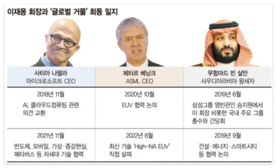 삼성그룹의 이재용 회장이 한국에서 글로벌 인사들(마이크로소프트 사티아 나델라 CEO, ASML 페테르 베닝크 CEO, 사우디아라비아 빈 살만 왕세자와의 회동이 유력한데, 이 거물급 인사들과의 미팅이 향후 삼성의 미래를 예측할 수 있을 것으로 보입니다.