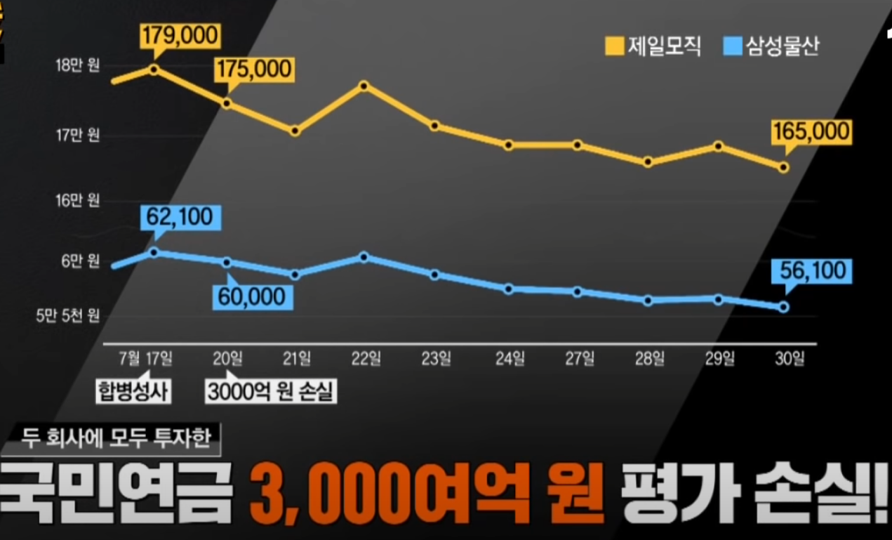 제일모직이 삼성물산보다 가치가 있다고 여기는 게, 제일모직은 자회사로 삼성바이오로직스라는 바이오 회사를 가지고 있었으며, 삼성바이오로직스의 미래 가치를 2015년에 억지로 끼어넣으면서, 제일모직의 가치를 뻥튀기한 것이었습니다. 그런데, 이 합병을 누가 손을 들어주었는 것인가? 바로 국민연금입니다. 국민연금은 삼성물산의 2대 주주였으며, 국민연금이 손해를 보면서까지 이 합병에 찬성을 한 것이었습니다. 바로, 삼성과 국민연금의 위법행위가 온 나라에 퍼지게 된 것이죠.
