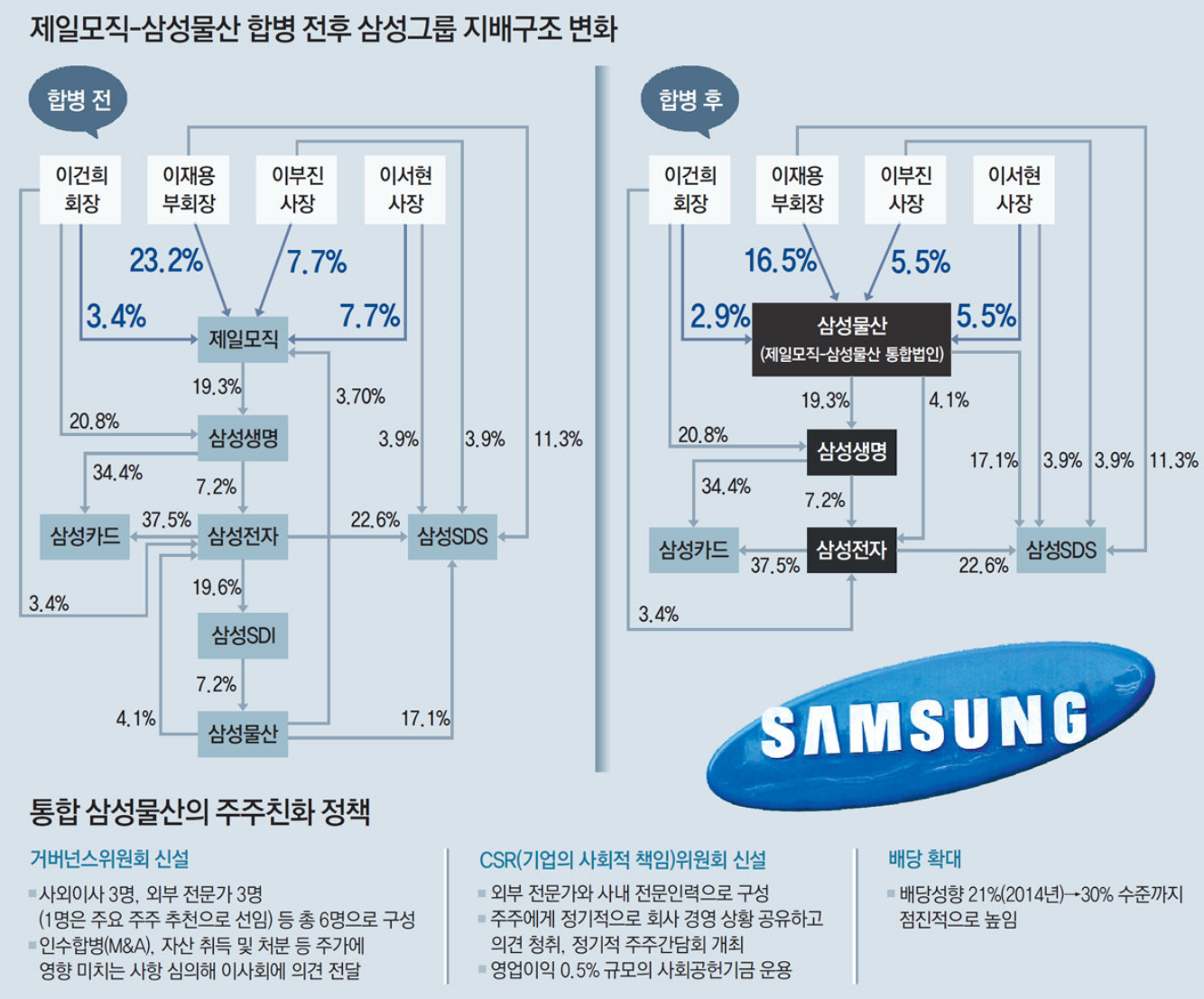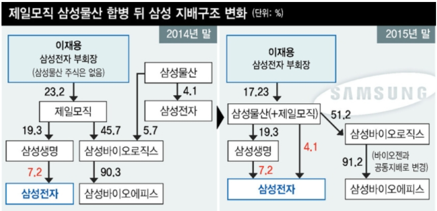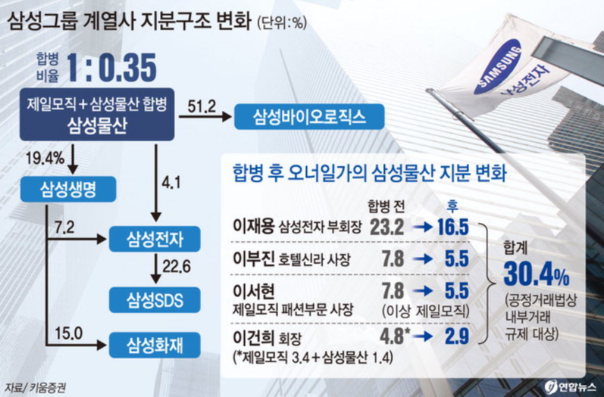 즉, 삼성전자는 삼성생명과 삼성물산이 1, 2대 주주였으며, 삼성생명 또한 이건희와 삼성물산이 1, 2대 주주였습니다. 따라서, 삼성물산을 지배하게 되면, 이건희 몫까지 합쳐서, 삼성생명에 41%의 지분을 확보하게 되는 것이며, 삼성생명을 확보하게 되면, 안정적으로 삼성전자의 오너가 될 수 있는 것입니다.