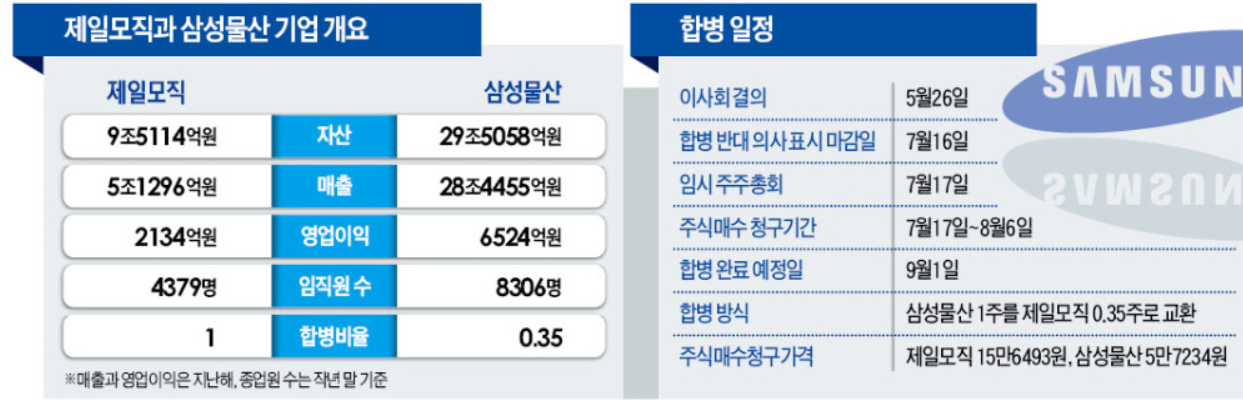 다시 정리를 하자면, 삼성의 최대 계열사 상징은 삼성전자임에는 분명하고, 삼성전자의 주인은 삼성물산입니다. 그런데, 삼성물산의 지분이 13%에 불과하여, 삼성그룹은 제일모직과의 합병을 추진하기로 한 거죠. 그런데, 문제는 두 회사를 합병하면서, 제일모직 주식 1주를 삼성물산 주식 3주로 계산했다는 것입니다. 따라서, 합병 후에는 이재용의 제일모직 지분 23%는 삼성물산의 16% 지분으로 계산되고, 엘리엇의 삼성물산 지분은 6%로 계산되는 말도 안 되는 일이 벌어진 것이었습니다. 당시 제일모직의 기업가치가 삼성물산의 기업가치보다 컸다고 하는데, 그 당시의 매출을 비교해 볼까요?