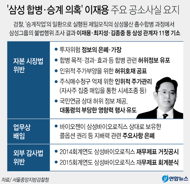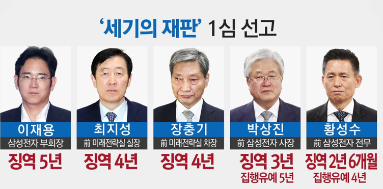삼성전자 회자 이재용에게 검찰이 징역 5년의 징역을 구형하였으며, 이는 경영권 승계를 위해 삼성물산과 제일모직 합병을 불법적으로 추진한 혐의를 받았었습니다. 2015년 9월 1일 제일모직이 삼성물산과의 합병 이후, 약 8년이 넘게 걸린 이 재판은 징역 5년과 벌금 5억 원이 선고되었습니다.