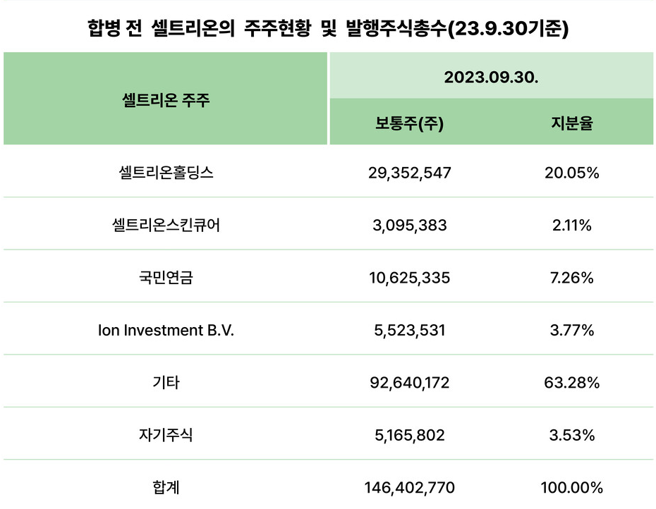셀트리온과 셀트리온헬스케어가 합병이 되면서, 셀트리온은 셀트리온헬스케어 주주들에게 셀트리온헬스케어 1주당 셀트리온 주식 0.4492620주를 발행해주기로 결정되었으며, 셀트리온홀딩스의 최대주주인 서정진 회장은 셀트리온 보유주식이 생기는 만큼, 셀트리온의 지배력이 더욱 강화될 예정입니다.