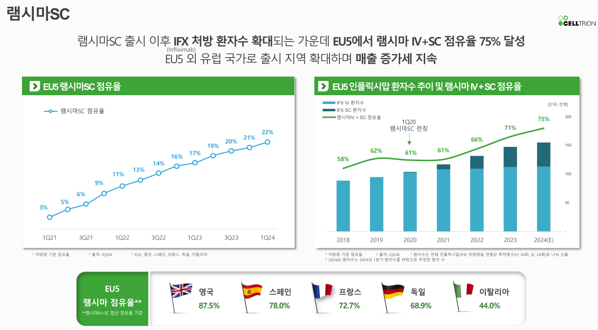 셀트리온은 램시마 IV형을 피하주사형 태인 SC형으로 세계 최초로 변경하며, 의사의 승인만 받게 된다면 집에서도 주사기를 이용하여 사용할 수 있는 제형입니다. 2020년도에 유럽시장에 진출한 지 4년이 지난 현재 램시마 SC는 유럽시장에서 22%의 시장점유율을 보이고 있으며, 특히 유럽 빅 5의 시장점 율이 매우 좋은 상태입니다.