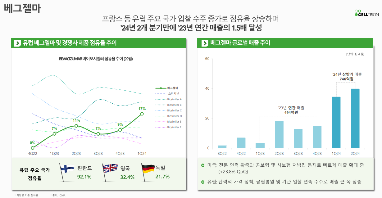 종양 억제제인 셀트리온의 베그젤마는 2022년 4분기 유럽 진출 후, 여러 바이오시밀러 제품보다 큰 시장점유율 증가폭을 기록하고 있으며, 현재 유럽시장에서 17%까지 오른 상태이며, 핀란드에서는 무려 92.1%의 시장점유율을 보이고 있으며, 영국, 독일, 프랑스 등에서도 입찰 수주가 증가 중에 있습니다.