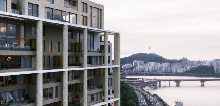 사업부지는 SM사옥과 청담건영아파트 사이이며, 한강변에 위치하고 있어서, 한강뷰 영구조망권 프리미엄이 붙어 있으며, 최소 104평에서 시작하여 펜트하우스 353평까지 있다고 하며, 1층 로비가 일반 아파트 3층에 해당되며, 층고가 높게 설정되어 있어서, 2층부터 한강조망이 가능하다고 합니다.