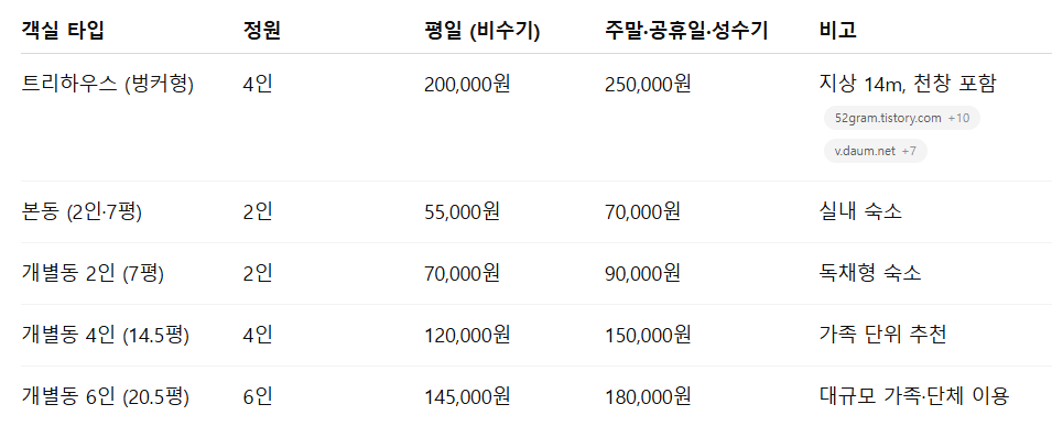 - 트리하우스는 4인 기준, 평일 20만 원 / 주말·성수기 25만 원