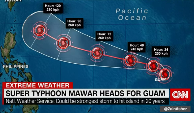 슈퍼태풍 마와르는 현재 괌을 통과하고 있으며, 5월 27일 필리핀에 상륙할 것으로 예상하고 있으며, 필리핀에 도착을 한 이후, 경로를 북동쪽으로 틀어 한국과 일본쪽으로 방향을 틀 것으로 예상하고 있습니다. 괌 현지에서는 이번 슈퍼태풍 마와르가 수십 년 동안 기억될 정도의 슈퍼태풍이며, 이번 슈퍼태풍으로 인한 피해를 분석하고 있습니다.