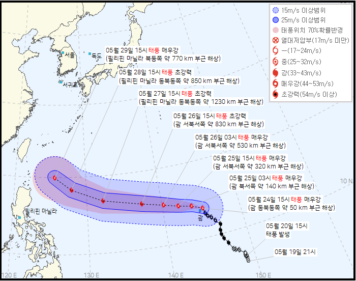 슈퍼태풍 마와르는 2023년 5월 20일에 발생이 되었으며, 5월 24일 현재 몸집을 키우면서, 현재 시속 241km 이상인 4등급의 슈퍼태풍급으로 몸집이 커진 상태입니다. 현재 괌을 관통하고 있으며, 괌에 접근하는 태풍 중 60년 만에 가장 거대한 태풍으로 기록될 것이라는 예측입니다.