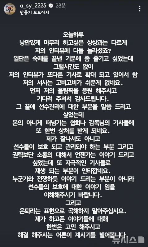 안세영은 어제 경기와 인터뷰 이후, 푹쉬고 난 뒤, 오늘 오전 본인의 인스타그램을 통해 다시 한번 입장을 밝혔습니다. 한 번은 고민해 주시고, 해결해 주시는 어른이 계시기를 빌어봅니다. 협회와 대표팀이 중요한 게 아니라 선수가 중요한데, 보호되고 관리받아야 할 선수들이 강제로 시합에 나가야만 하는 부분은 바뀌어야 한다고 봅니다.