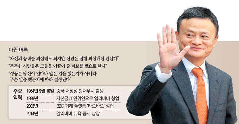 마윈은 1995년도 미국에 방문했다가 컴퓨터를 보고 반하였으며, 그 후 중국 최초의 인터넷기업인 차이나엘로우페이지를 설립하였으나, 중국에서는 인터넷 변방국가로 유명하다보니, 사기꾼이라는 말만 듣고 망했으며, 1999년에서야 IT버블 때 인터넷의 트렌드에 따라 전자상거래인 알리바바를 창업하였습니다. 1억 원의 자본금으로 45평짜리 마윈 자택에 모여 18명의 창업 멤버가 하루 17시간씩 일한 끝에, 1999년 3월에 홈페이지가 완성되었으며, 마윈은 38차례나 투자거절을 당했지만, 8월경 골드만삭스로부터 500만 달러를 투자받았으며, 2000년에는 그 유명한 소프트뱅크의 손정의 회장을 만나 단 6분 만에 투자결정을 내렸습니다.