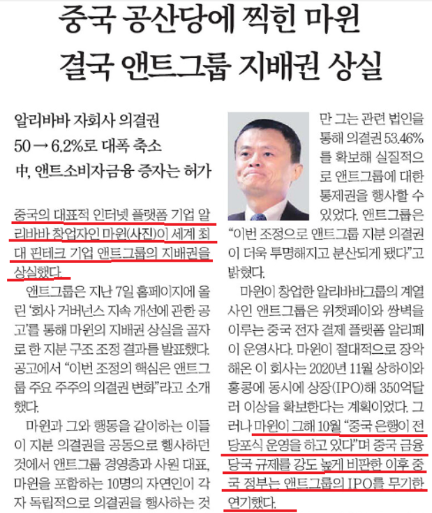 마윈은 2020년 10월 중국 금융당국이 지나치게 보수적이고 경직된 규제 감독에 치중하고 있다고 직설적으로 비판하기도 하였는데, 그 이후, 앤트그룹의 기업공개(IPO) 절차를 전격 중단당하는 초강수에 마위은 큰 타격을 입기도 하였습니다. 이는 마윈이 중국 금융시스템의 후진성을 비판하고, 중국 공산당에게 정면으로 도전한 샘으로 비쳤으며, 중국 당국으로부터 호출을 당해, 수일간 감금당하는 일도 겪기도 했습니다. 앤트그룹의 기업공개는 345억 달러를 조달하는 인류 역사상 최대 IPO가 될 것으로 주목받았는데, 당국이 이를 취소시켜 버렸으며, 이 때문에, 미국 뉴욕증권거래소에 상장된 알리바바 주식 또한 폭락하고 말았습니다.