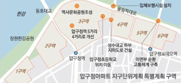 압구정 현대아파트는 제3 구역과 4 구역 일부에 속하고 있으며, 조합설립 동의를 받은 상태로, 재건축 호재로 시세는 현재 고공행진 중에 있습니다. 하지만 매우 노후화된 아파트로서, 언제 무너질지 모르는 상태로 보이지만 서울시가 50층 고층 아파트를 짓겠다고 선언한 터라, 압구정 현대아파트가 재건축이 된다면 시세는 부르는 게 값일 정도로 호가가 매우 급등할 것으로 보입니다.