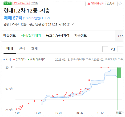 압구정 현대아파트의 141㎡(43평형)의 경우에는 2016년도는 25억이었으나, 현재는 80억까지 오른 상태로, 재건축이 된다면 100억은 기본으로 넘을 것 같습니다. 전세가의 경우에는 15억에서 30억 사이로 나오며, 최근 들어 현금의 가치가 너무 많이 떨어진 것 같습니다. 최근 부동산 경기 침체로 아파트 가격이 떨어졌다는 뉴스가 많이 나오고 있는데, 압구정 현대아파트는 일반 아파트가 아니다 보니 점점 우상향 하는 것 같습니다. 현재 압구정 현대아파트는 조합설립인가가 완료되었으며, 이제 상업시행인가와 관리처분인가를 대기하고 있으며, 이 또한 2~3년 걸릴 듯하며, 철거와 더불어 착공까지도 추가 3년이 소요될 듯하니, 2030년쯤 분양이 되지 않을까 싶습니다.