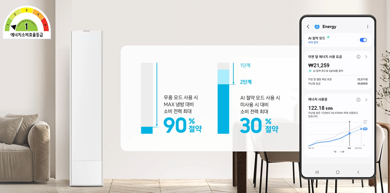 삼성 비스코프 AI 무풍 갤러리 에어컨은 에너지 소비 효율이 1등급으로 에너지 부담은 줄이고, 쾌적함을 높여주며, 1단계 최대 10%, 2단계 최대 30%까지 소비 전력을 절약할 수 있습니다. 움직이지 않아도, AI 집사가 알아서 온도를 관리해주며, 에어컨이 꺼진 상태에서도 AI가 알아서 실내 온도, 습도 등을 케어해 줍니다.