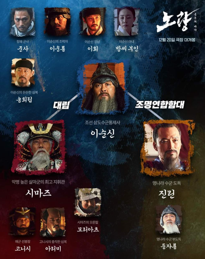 이때, 이순신은 '절대 이렇게 전쟁을 끝내서는 안 된다'며, 왜군을 완벽하게 섬멸하는 것이 이 전쟁을 올바르게 끝내는 것이라 생각한 이순신은 명나라와 조명연합함대를 꾸려 왜군의 퇴각로를 막고 적들을 섬멸하기로 결심하게 됩니다. 하지만, 왜군의 뇌물 공세에 넘어간 명나라 도독 진린은 왜군에게 퇴로를 열어주려 하고, 설상가상으로 왜군 수장인 시마즈의 살마 군까지 왜군의 퇴각을 돕기 위해 노량으로 향하게 되는데, 이순신의 마지막 전투였던 노량해전에서 이순신이 어떻게 죽음을 맞이하게 될지가 관건인 영화입니다.