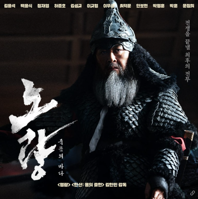 노량 죽음의 바다는 2014년도 명량, 2022년 한산 용의 출현에 이은 김한민 감독의 이순신 영화 3부작으로, 마지막 편입니다. 임진왜란의 마지막 전투였던 노량 해전과 충무공 이순신의 죽음을 다룬 영화이며, 임진왜란 발발 이후, 7년이 지난 1598년 12월 이순신은 왜군의 수장이던 도요토미 히데요시가 갑작스럽게 사망한 뒤, 왜군들이 조선에서 황급히 퇴각하려 한다는 것을 알게 됩니다.