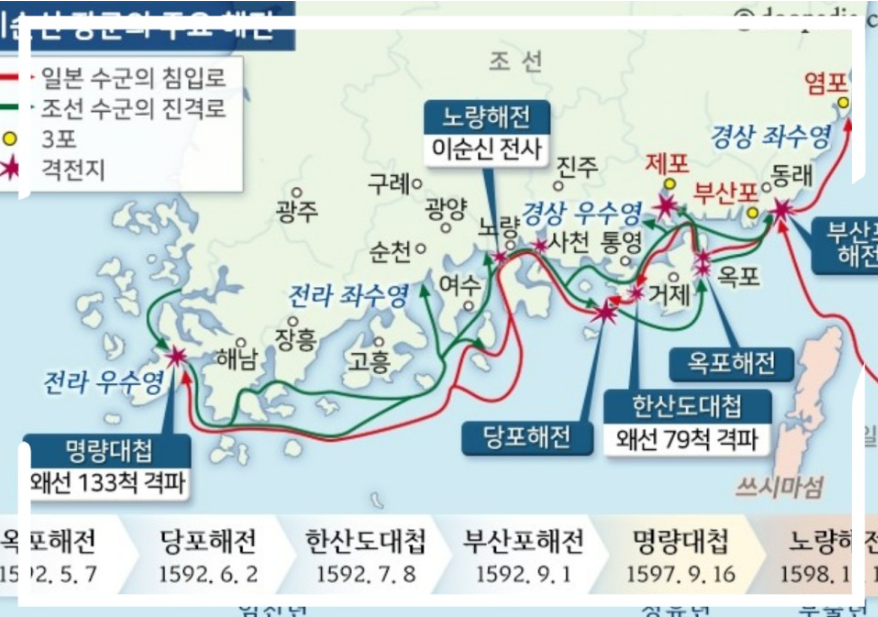 임진왜란(1592년~1598년) 6년 동안 해전이 47차례 벌여졌는데, 그동안 이순신 장군의 전적은 43전 38승 5 무로 역사에 기록될 정도로, 이순신 장군은 그야말로 해전에 있어서는 최고의 지휘관이었습니다. 일본이 전쟁을 일으키며, 전쟁 중에 가장 중요한 것은 보급로인데, 이순신 장군으로 인해, 보급로가 끊기게 되면서, 더 이상 일본군은 조선에서 장기간 전쟁을 할 수가 없었으며, 이 때문에, 임진왜란은 종결되었다고 보면 될 것 같습니다. 330척의 일본군에 맞선 단 12척의 배로 유명한 명량해전부터 시작하여, 이순신의 마지막 전쟁이었던 노량해전에서는 '나의 죽음을 적에게 알리지 말라!'라는 한마디가 죽어가면서까지 전쟁의 승리를 가져다주기도 하였습니다.