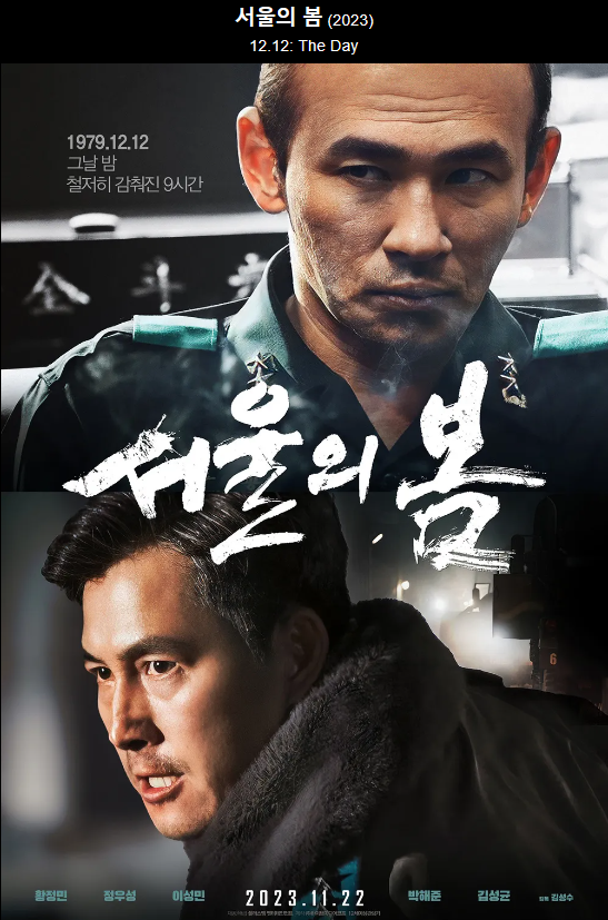 아수라, 무사, 태양은 없아, 비트 등을 만든 김성수 감독의 신작인 '서울의 봄'은 12.12 군사반란을 모태로 만든 영화이며, 황정민, 정우성뿐만 아니라, 이성민, 김성균, 박해준, 정만식, 김의성, 이준혁, 정해인 등 쟁쟁한 배우들이 대거 출연하여 기대를 모으고 있는 영화이며, 12.12 군사반란을 20년 전 제5 공화국이라는 드라마로 다룬 적은 있으나, 영화로 만든 것은 이번이 처음입니다.