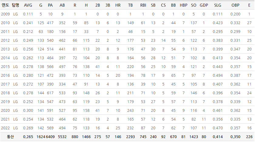 오지환은 프로 14년동안 평균 타율 0.265, 146홈럼, 745타점, 245도루 OPS 0.764를 기록하였으며, 지난해에는 LG트윈스의 주장으로서 거포능력까지 선보이며, 유격수 부문 첫 골든글러브를 수상하기도 하였습니다. 지난시즌 20-20 클럽에도 가입한 것도 처음 있는 일이었습니다.
