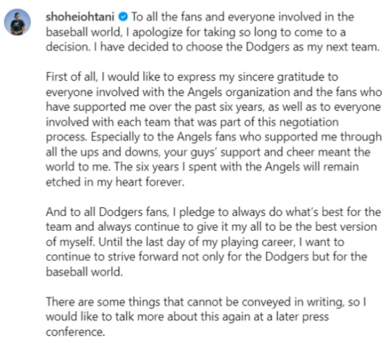 오타니는 그리고 모든 다저스 팬들에게, 저는 항상 팀을 위해 최선을 다할 것을 다짐한다. 또 항상 저 스스로 최고의 모습을 보여드릴 수 있도록 최선을 다하겠다고 재차 다짐하며 약속했습니다. 오타니는 선수생활이 끝나는 마지막 날까지, 저는 다저스뿐만 아니라 아구계를 위해 계속해서 노력하고 싶다면서, 글로는 다 전달할 수 없는 부분들이 있으니, 추후 기자회견을 통해 이런 부분에 관해 좀 더 많은 이야기를 나누고 싶다며, 정말 감사합니다.라고 인사했습니다.