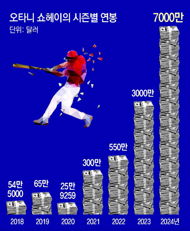 메이저리그 진출 첫해인 2018년 오타니의 연봉은 불과 54만 5000달러로, 한화로 약 7억 5천만 원에 불과하였지만, 메이저리그 4년 차인 2020년도 그의 연봉은 300만 달러(약 41억 원)로 수직 상승합니다.
