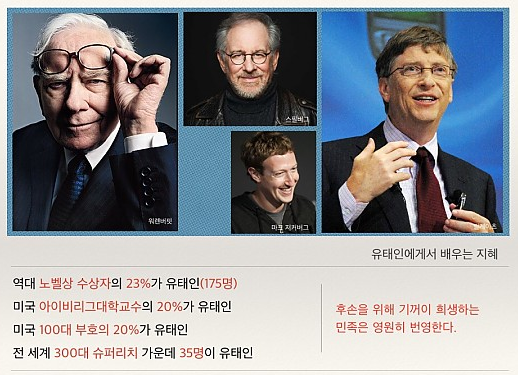 유대인들 중에는 성공한 사람이 굉장히 많이 있습니다. 현재 세계를 리드하고 있는 정치, 경제인들 중에는 많은 유대인들이 차지하고 있으며, 포춘지가 선정한 글로벌 기업 100개의 기업中, 약 40개 기업의 CEO들이 바로 유대인들이며, 세계 억만장자 중 약 30% 이상이 유대인들입니다. 성공한 사람과 부자로 살고 있는 사람들 중에는 왜 유대인이 많을까요? 그럼, 유대인의 역사와 성공한 유대인에 대해 알아보겠습니다.