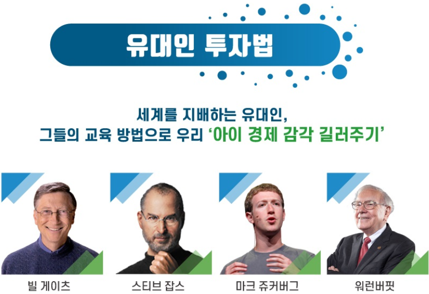워런 버핏은 어려서부터 신문 배달을 하거나 유원지에서 음료수 장사를 하면서, 시장경제 원리를 터득하여 11세부터 직접 주식투자를 한 것으로 유명하죠. 하버드 법대를 중퇴한 마이크로소프트 창업자 빌 게이츠의 아버지는 아들이 어릴 적부터 물건을 살 때마다 용돈 기입장에 기록하게 하고, 사례 중심의 토론을 벌이는 등 자녀 경제 교육에 시간과 노력을 들였습니다.