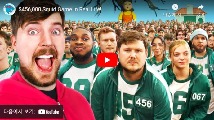 또한, 참가자 전원에게는 2천달러(약 240만원)씩이 제공되었으며, 91만불(약11억원)에 대해서는 455명에게 지원되었으며, 이 영상의 조회수는 3억5천만회를 기록하며 MrBeast 영상 중 Top1에 해당되었습니다. 그 정도로 오징어게임은 미국뿐만 아니라, 전 세계에서 엄청난 팬덤을 일으키고 있던 영화였습니다.