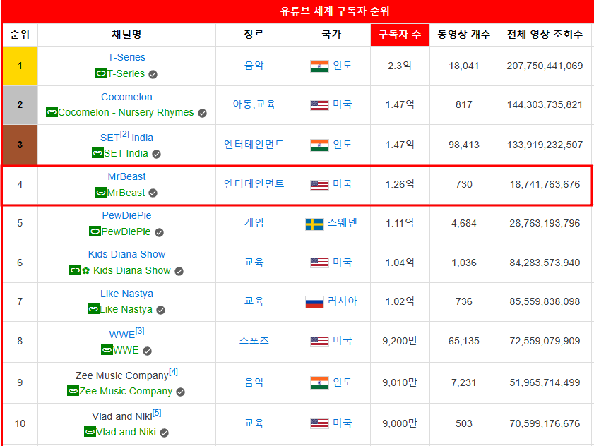그리고 4위에 있는 MrBeast는 개인 1위의 유튜브 채널이며, 약 1억 3천만명의 구독자를 보유하고 있는 미국의 엔테테인먼트 채널입니다.