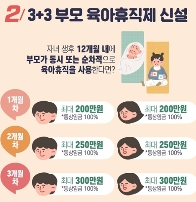 기존에 육아휴직 급여는 부부 중 1인에게만 지급되었기 때문에, 한 명에게 육아가 전가되는 '독박유아'라는 비판이 있었지만, 현재는 부부 동시 육아휴직도 지원하기로 결정하였습니다. 2024년부터 생후 18개월 이내 자녀를 돌보기 위해 맞벌이 부모가 모두 육아휴직을 사용한 경우, 첫 6개월에 대한 육아휴직급여를 통상임금의 100%로 지원하게 되었습니다.