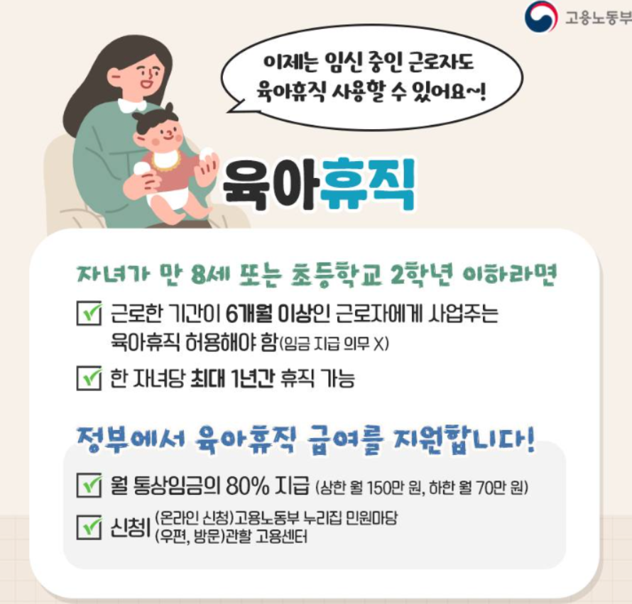 육아휴직은 자녀의 양육을 위해 일정기간 동안 휴직할 수 있는 제도를 말하며, 한국에서는 만 8세 이하 또는 초등학교 2학년 이하의 자녀를 가진 근로자가 사용할 수 있는 것으로 규정하고 있습니다. 유급 휴가의 출산전후 휴가와는 다른 제도입니다. 육아휴직 기간에는 정부에서 육아휴직 급여를 지원하고 있고요, 월 통상 임금의 80%를 지급하며, 상한선은 월 150만원이며, 하한선은 월 70만원입니다.